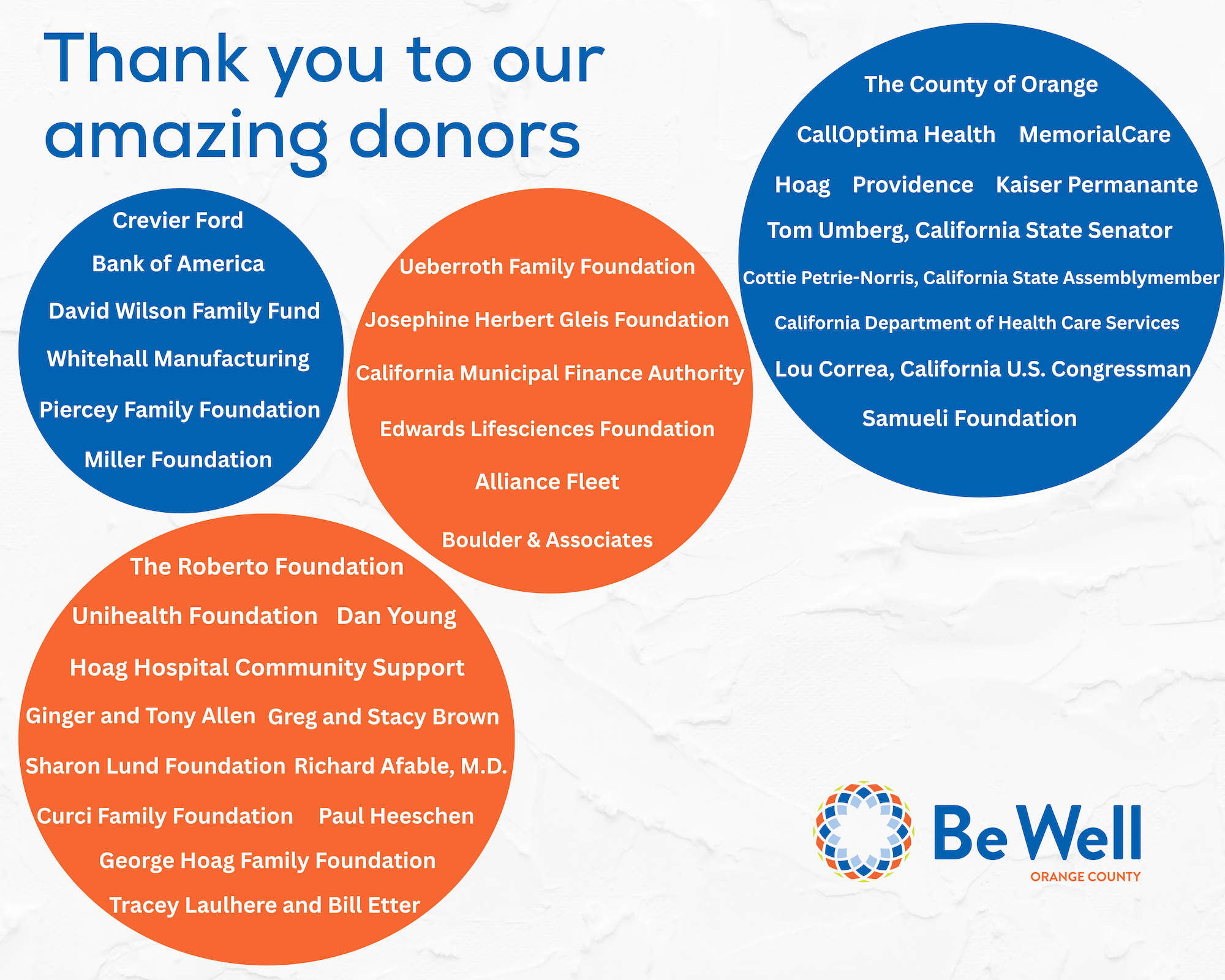 Whether you are setting up a crowdfunding campaign or making an individual donation, you can direct your contribution to address a variety of different Be Well OC funding priorities. For more information about supporting the work of Be Well OC, please contact Blair Contratto by emailing blair.contratto@bewelloc.org.